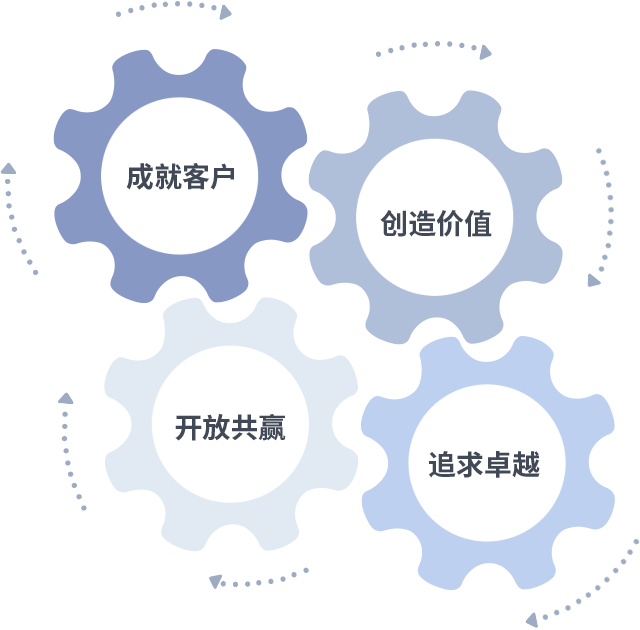 成就客户是一切决策的出发点,创造价值是衡量所有工作的标准,追求卓越是杏彩做事做人的态度,开放共赢是杏彩的格局也是最终的结果。价值观的齿轮环环相扣,推动着组织里的每个人不断向前。